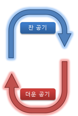 대류 현상을 예로 한가지 더 설명 드리면, 높은 온도의 공기는 위로 낮은 온도의 공기는 밑으로 향하는게 대류 현상입니다. 어떠한 물을 끓이게 되면, 불에 닿아있는 냄비의 아랫부분의 물이 데워져 위로 올라가고 위쪽의 상대적으로 덜 덥혀진 물들이 아래 쪽으로 내려가며 순환하여 전체 물을 고르게 덥히는 현상과 같습니다.