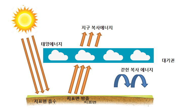 열을 가진 모든 물체는 복사를 통해 열을 내보내거나 흡수합니다. 이러한 원리로 지구 표면이 따듯해지는 이유는 해빛이 직접 공기를 달궈서 더워지기보다는 지표면이 햇볕을 받아 더워지면서 발산하는 복사열이 대기의 온도를 높이면서 더워 집니다.