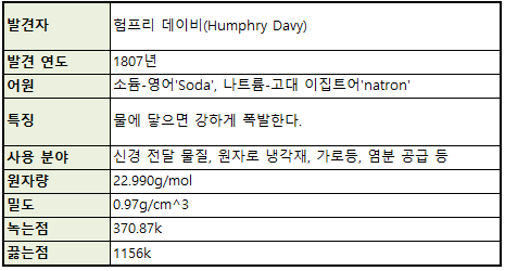 원소기호 Na, 원자번호 11, 원자량 22.9898, 녹는점 97.90℃, 끓는점 877.50℃, 비중 0.971(20℃)을 갖고 있습니다. 보통 소금이랑 같은 물질로 알고 있지만 다른 원소와 결합하지 않은 순수한 나트륨은 엄연한 금속 입니다.