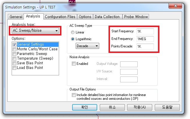 세번째로는 AC Sweep입니다. 세팅된 값은 저항값이 아닙니다. 주파수 입니다. 참고하세요~