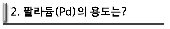 현재 가솔린 및 디젤 자동차에 장착하여 사용되고 있는 촉매 변환기내 촉매의 핵심 구성성분은 바로 백금족 원소 중백금(Pt), 팔라듐(Pd), 지난 시간에 소개한 원자번호 46번 로듐(Rh)가 있습니다. 이 중에서도 팔라듐((Palladium)은 배기가스 중 일산화탄소나 미연소 탄화수소류를 산화시켜 이산화탄소와 물로 변환시키는 역할을 합니다.