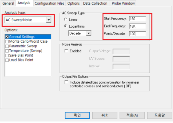 analysis type : AC Sweep/Noise 로 변경 해줍니다. AC Sweep type은 계산하신 차단 주파수의 보통은 시작주파수에 1/10 end주파수는 차단 주파수에 10배정도 정의합니다.