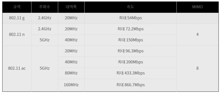 위 사진은 IEEE 802.11 규격입니다. 위에서 설명드린 것처럼 대역폭이 클 수록 데이터 속도가 빨라집니다.